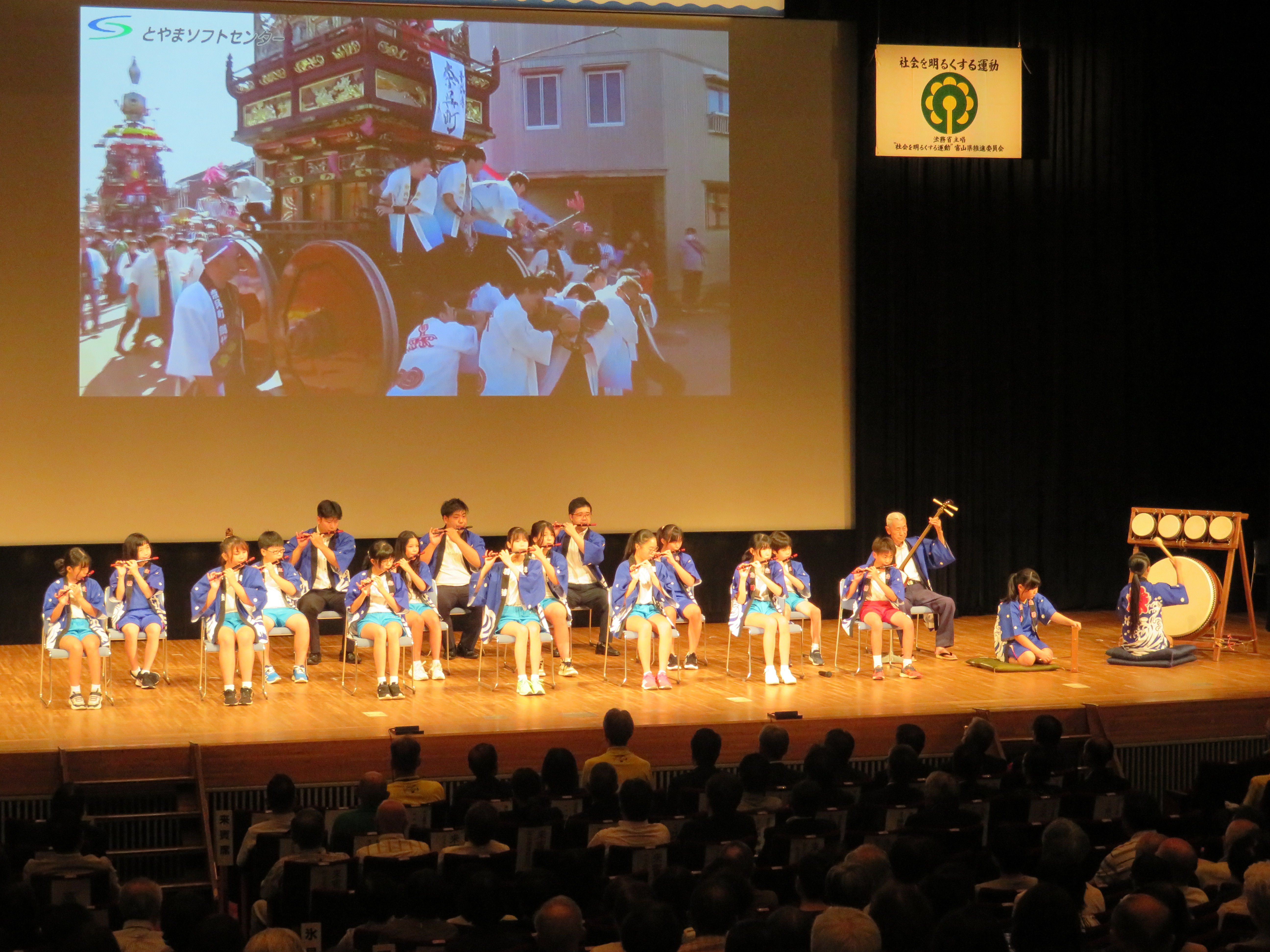 オープニングに際して、新湊放生津小学校の生徒さんに「曳山囃子」を演奏していただきました。